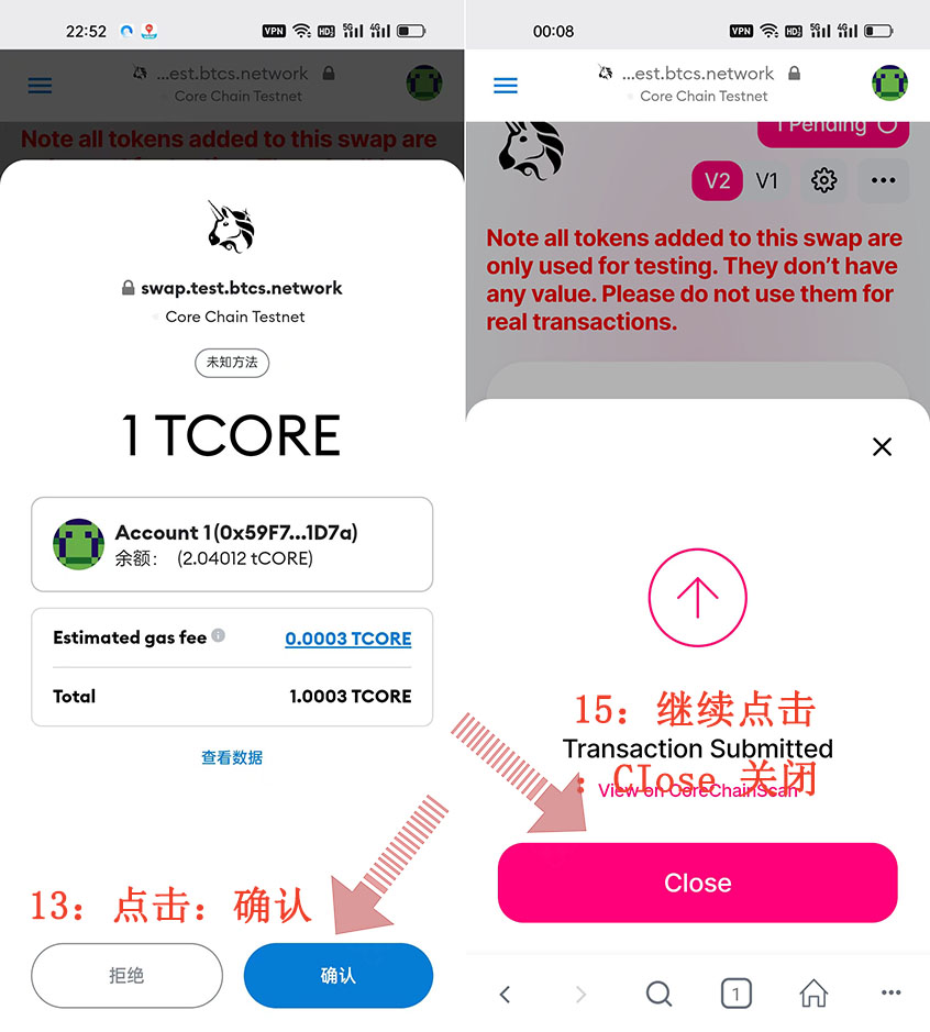 13:點(diǎn)擊:確認(rèn)、15:繼續(xù)點(diǎn)擊:CIose 關(guān)閉