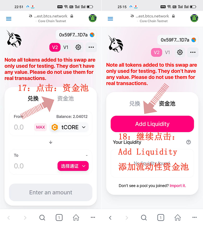 17:點(diǎn)擊:資金池、18:繼續(xù)點(diǎn)擊:Add Liquidity 添加流動(dòng)性資金池