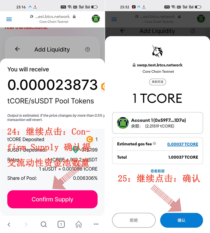 24:繼續(xù)點(diǎn)擊:Confirm Supply 確認(rèn)提交流動(dòng)性資金池?cái)?shù)量、25:繼續(xù)點(diǎn)擊:確認(rèn)
