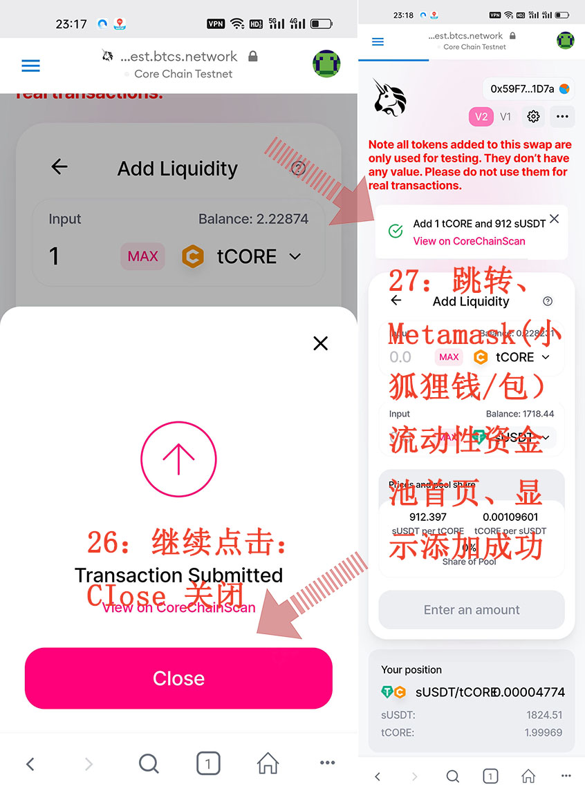 26:繼續(xù)點(diǎn)擊:CIose 關(guān)閉、27:跳轉(zhuǎn)、Metamask(小狐貍錢(qián)/包)流動(dòng)性資金池首頁(yè)、顯示添加成功