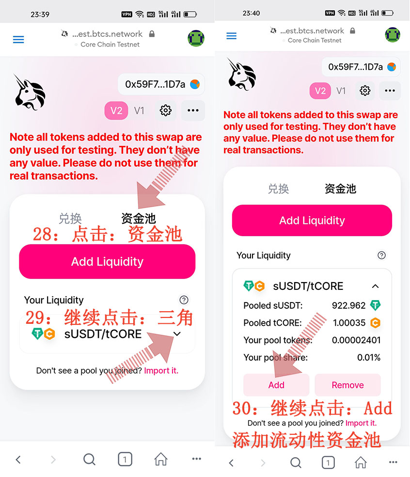 28:點(diǎn)擊:資金池、29:繼續(xù)點(diǎn)擊:三角、30:繼續(xù)點(diǎn)擊:Add 添加流動(dòng)性資金池