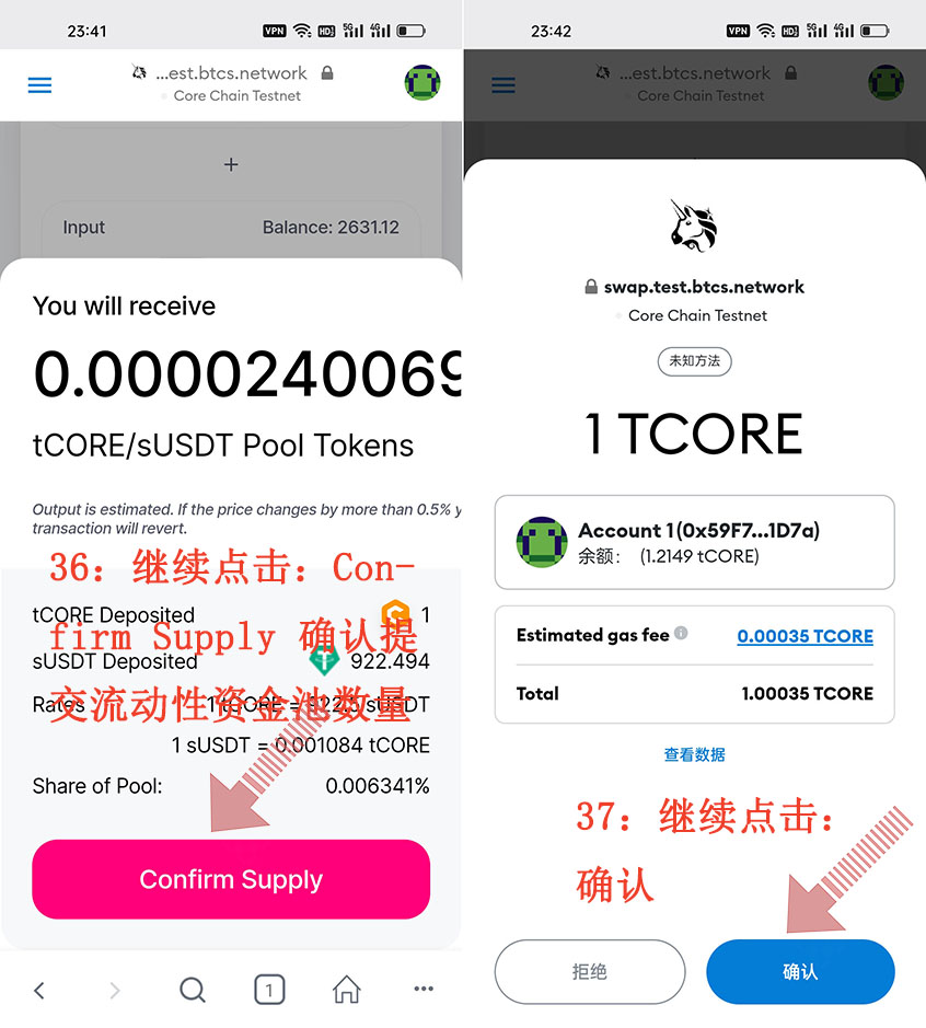 36:繼續(xù)點(diǎn)擊:Confirm Supply 確認(rèn)提交流動(dòng)性資金池?cái)?shù)量、37:繼續(xù)點(diǎn)擊:確認(rèn)