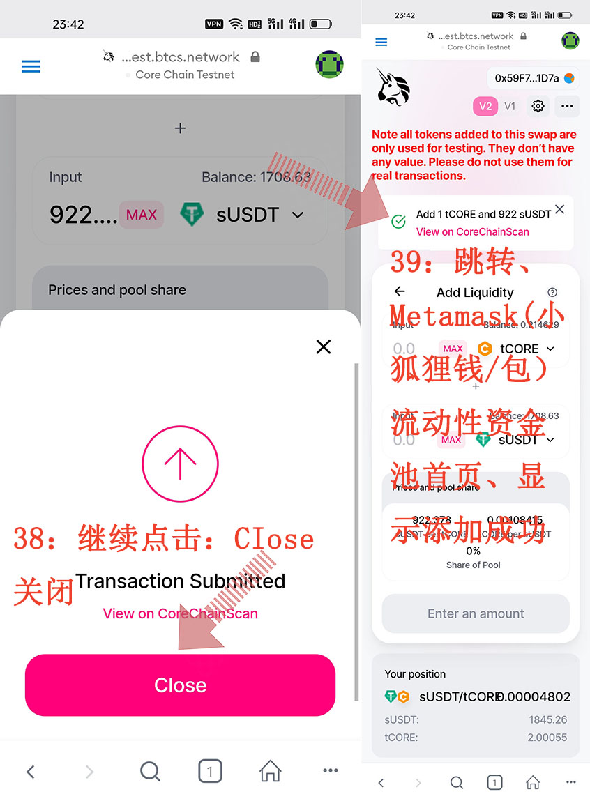 38:繼續(xù)點(diǎn)擊:CIose 關(guān)閉、39:跳轉(zhuǎn)、Metamask(小狐貍錢(qián)/包)流動(dòng)性資金池首頁(yè)、顯示添加成功