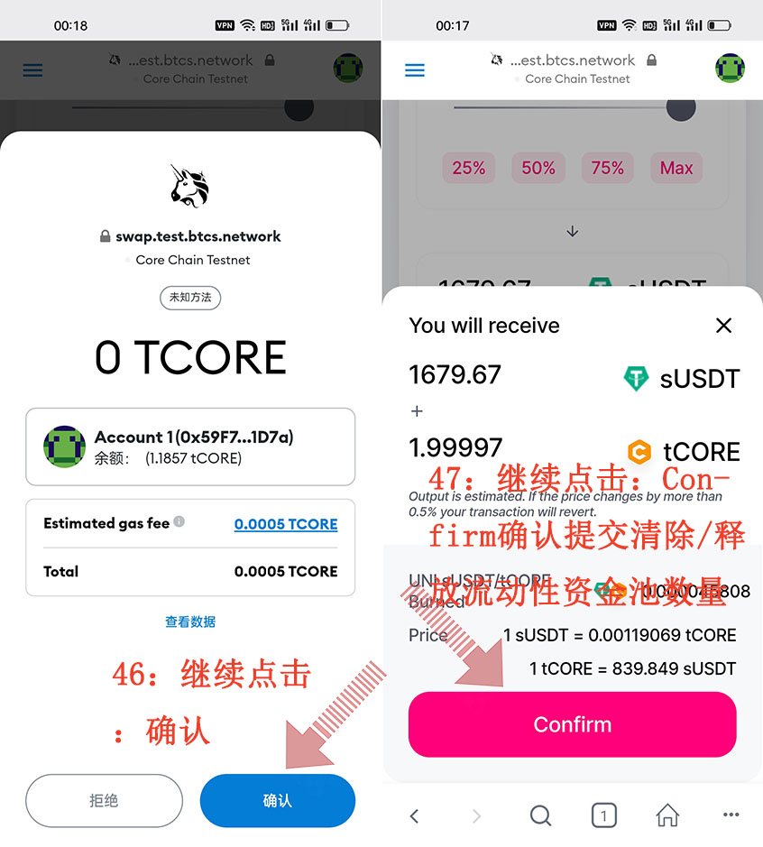 46:繼續(xù)點(diǎn)擊:確認(rèn)、47:繼續(xù)點(diǎn)擊:Confirm確認(rèn)提交清除/釋放流動(dòng)性資金池?cái)?shù)量