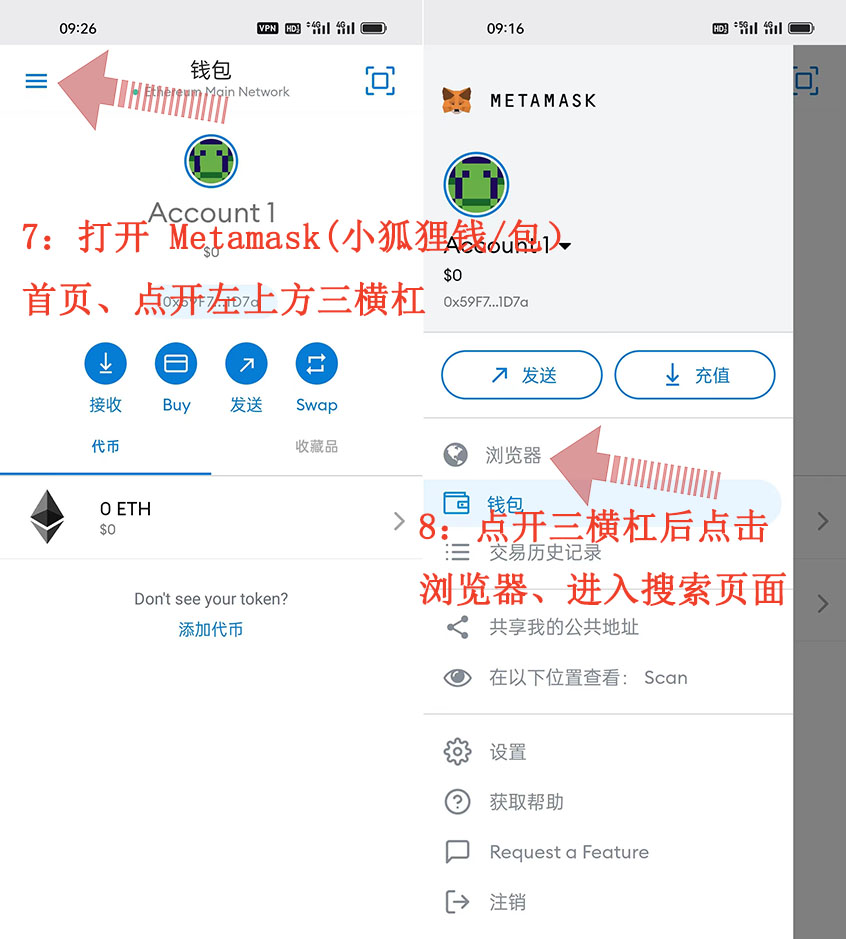 7:打開 Metamask(小狐貍錢/包)首頁、點(diǎn)開左上方三橫杠