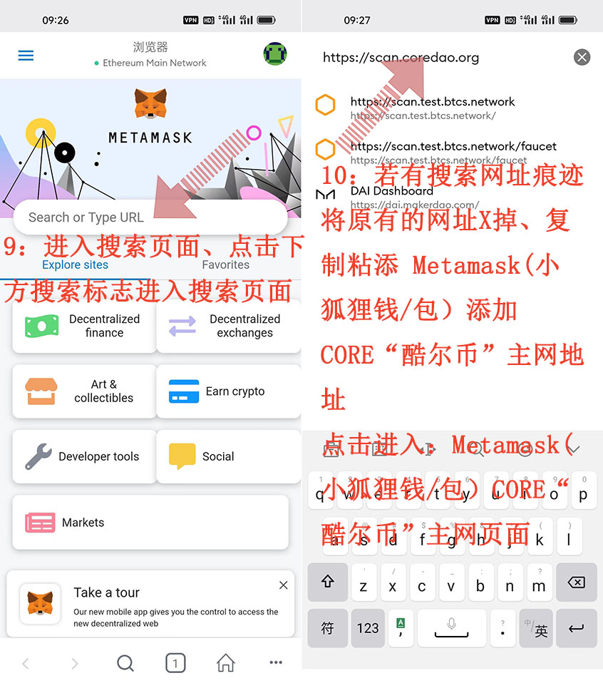 10:若有搜索網(wǎng)址痕跡將原有的網(wǎng)址X掉、復(fù)制粘添 Metamask(小狐貍錢/包)添加CORE“酷爾幣”主網(wǎng)地址