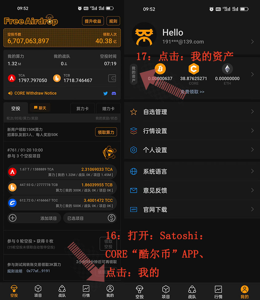 16:打開:Satoshi:CORE“酷爾幣”APP、點(diǎn)擊:我的、17:點(diǎn)擊:我的資產(chǎn)