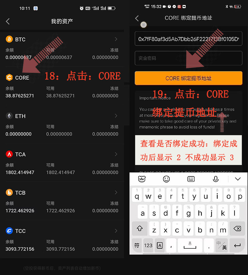 18:點(diǎn)擊:CORE、19:點(diǎn)擊:CORE綁定提幣地址