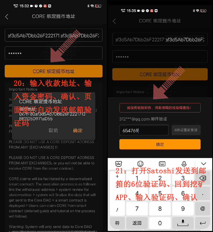 21:打開Satoshi發(fā)送到郵箱的6位驗證碼、回到挖礦APP、輸入驗證碼、確認(rèn)