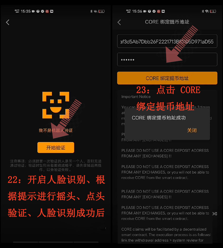 22:開啟人臉識別、根據(jù)提示進(jìn)行搖頭、點(diǎn)頭驗證、人臉識別成功后、23:點(diǎn)擊 CORE 綁定提幣地址