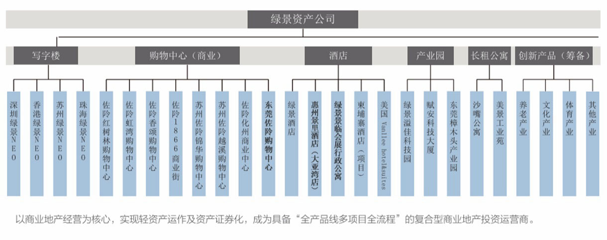綠景集團旗下專業(yè)不動產(chǎn)資產(chǎn)管理公司,全面管理綠景集團商業(yè)地產(chǎn)項目及所有持有型經(jīng)營性不動產(chǎn)共分五條產(chǎn)品線:購物中心(商業(yè))、寫字樓、長租公寓、產(chǎn)業(yè)園及酒店已運營項目包括超甲級寫字樓品牌——NEO都市商務綜合體、高星級酒店——綠景錦江酒店、重點打造的綠景商業(yè)地產(chǎn)主流品牌——佐阾購物中心系列。籌劃階段項目為白石洲超級城市綜合體等