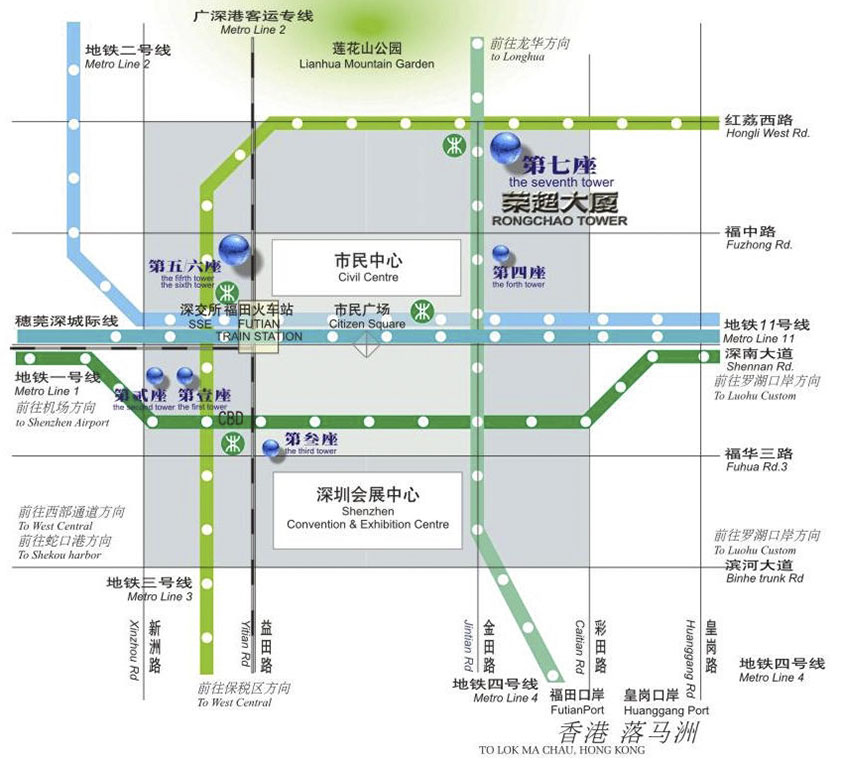 車(chē)行至羅湖火車(chē)站:皇崗口岸、深圳機(jī)場(chǎng)分別用時(shí)約15、5、35分鐘、地鐵1、2、3、4號(hào)線已經(jīng)通車(chē)、至榮超大廈6分鐘