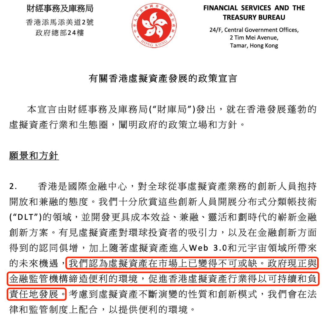 2022年10月,香港在發(fā)表的《有關(guān)虛擬資產(chǎn)在港發(fā)展的政策宣言》中提到,香港是國際金融中心,對全球從事虛擬資產(chǎn)業(yè)務的創(chuàng)新人員抱持開放和兼融的態(tài)度。香港政府正與金融監(jiān)管機構(gòu)締造便利的環(huán)境,以促進香港虛擬資產(chǎn)行業(yè)得以可持續(xù)和負責任地發(fā)展