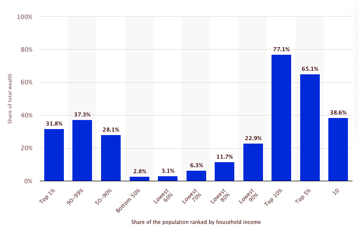 在過去的幾十年里,全球財富分配的不平等變得更加明顯。截至 2022 年,美國最富有的10%的人擁有美國近70%的財富,這意味著該國90%的人只擁有30%的財富。在南非,收入最高的10%的人占有65%的財富
