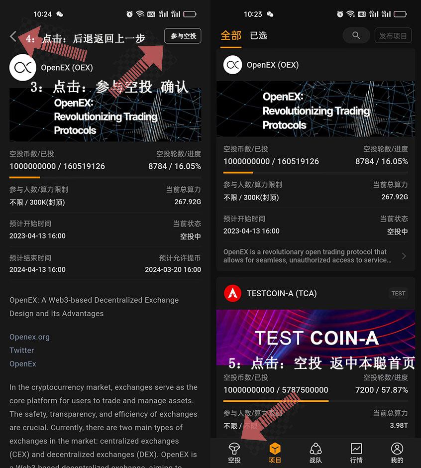 3:點(diǎn)擊:參與空投、確認(rèn)、4:點(diǎn)擊:后退返回上一步、5:點(diǎn)擊:空投 返中本聰首頁(yè)