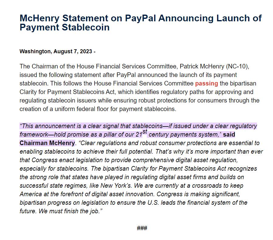 雖然這個(gè)法案何時(shí)能成為真正的法律仍存不小的變數(shù),但該委員會(huì)的主席、共和黨眾議員Patrick McHenry也在周一發(fā)布聲明力挺PayPal,表示(PayPal的)這一公告是一個(gè)明確的信號(hào),表明穩(wěn)定幣——如果在明確的監(jiān)管框架下發(fā)行——有望成為美國(guó)21世紀(jì)支付系統(tǒng)的支柱