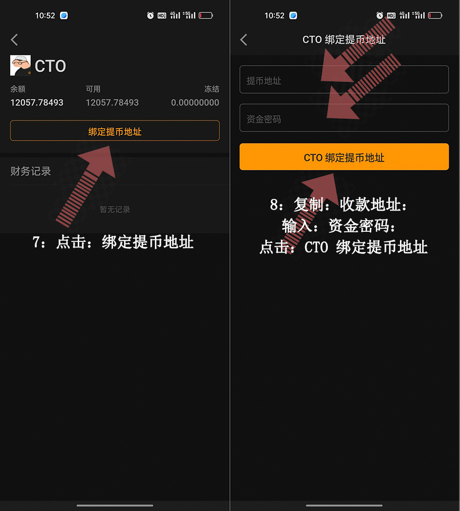 8:復(fù)制:收款地址:輸入:資金密碼:點(diǎn)擊:CTO 綁定提幣地址