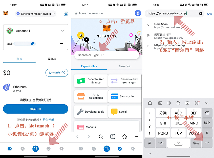 3:輸入:網(wǎng)址添加:CORE“酷爾幣”網(wǎng)絡(luò):