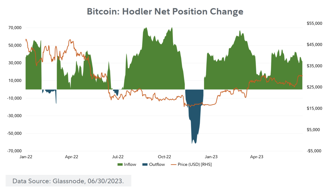 比特幣長(zhǎng)期持有者對(duì)最近的訴訟事件不受影響,從“Hodler Net Position Change”數(shù)據(jù)中可以看出,他們持續(xù)在約30,000美元水平附近累積