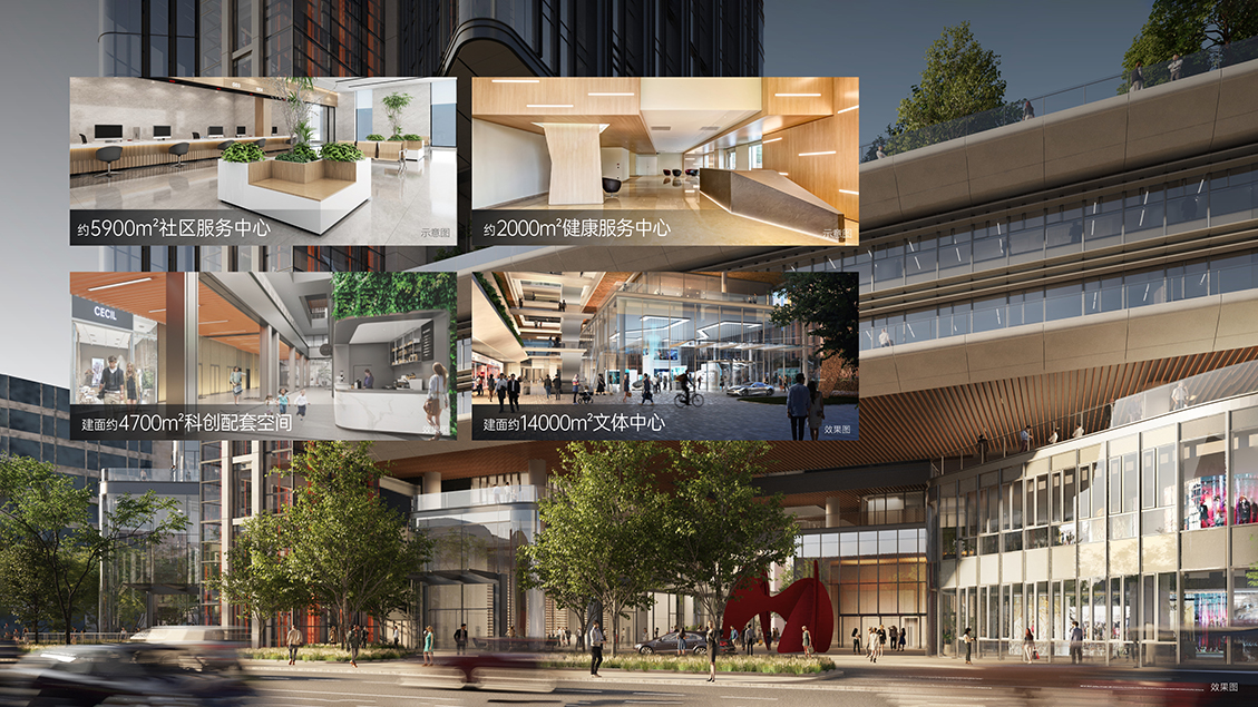 全時活力樞紐建面約:4700m2、科創(chuàng)配套空間:建面約:5900m2 社區(qū)服務(wù)中心、建面約:2000m2健康服務(wù)中心于一體、毗鄰建面約:14000m2文體中心、營造多元都市生活新方式