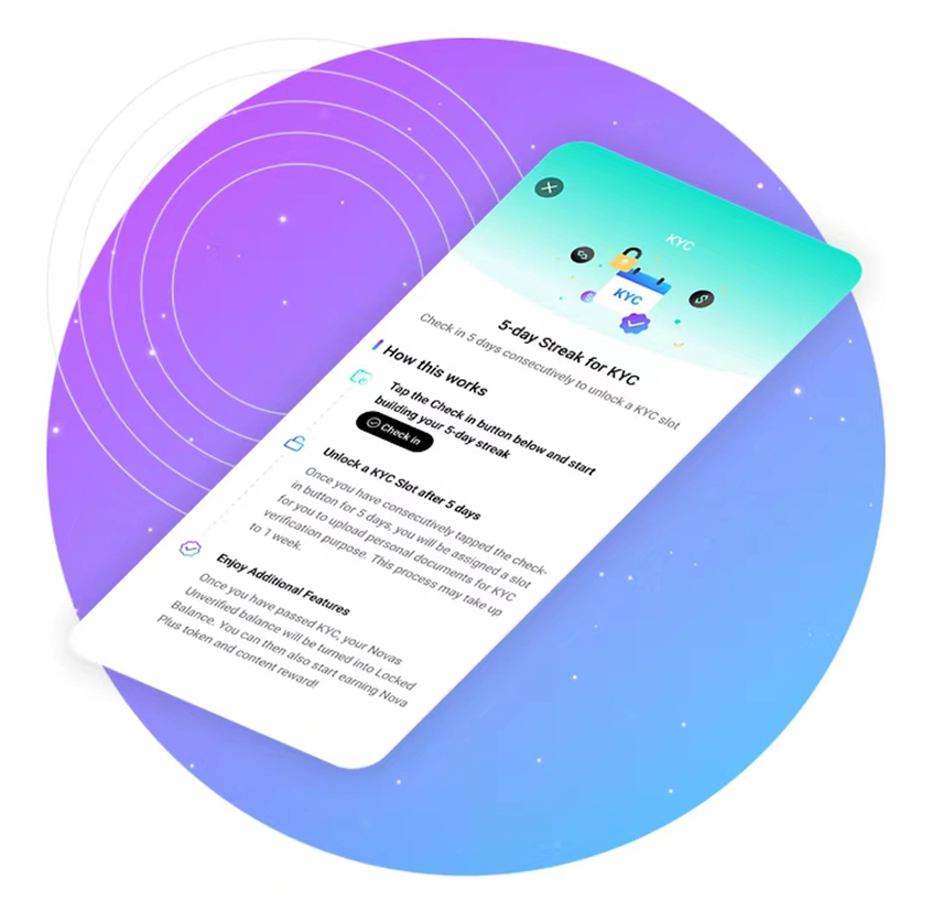 用戶在連續(xù)登錄 Nova Network 一定數(shù)量的天數(shù)后有資格進(jìn)行KYC。一旦您通過(guò)了 KYC,您可以開始同時(shí)獲得 Novas Plus 代幣和 Novas 代幣的獎(jiǎng)勵(lì)。