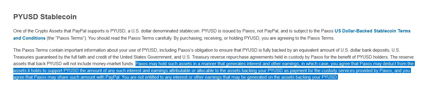 由此,我們可以通過 Paypal Cryptocurrency 的用戶條款中看到 Paxos 作為發(fā)行方有權(quán)享有法幣資產(chǎn)托管而產(chǎn)生的費(fèi)用,這些費(fèi)用將與 Paypal 分享,這些收益與 PYUSD 穩(wěn)定幣持有者沒有任何關(guān)系