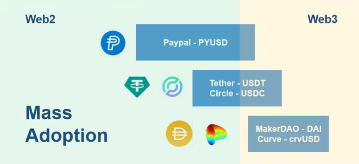 中心化 Paypal 發(fā)行的 PYUSD 穩(wěn)定幣和 Tether 的 USDT,Circle 的 USDC 并無本質(zhì)區(qū)別。如何應(yīng)對(duì)明牌的競(jìng)爭(zhēng),唯有通過 Web2 拉新并提高市場(chǎng)占有率,帶動(dòng)加密市場(chǎng)的Mass Adoption