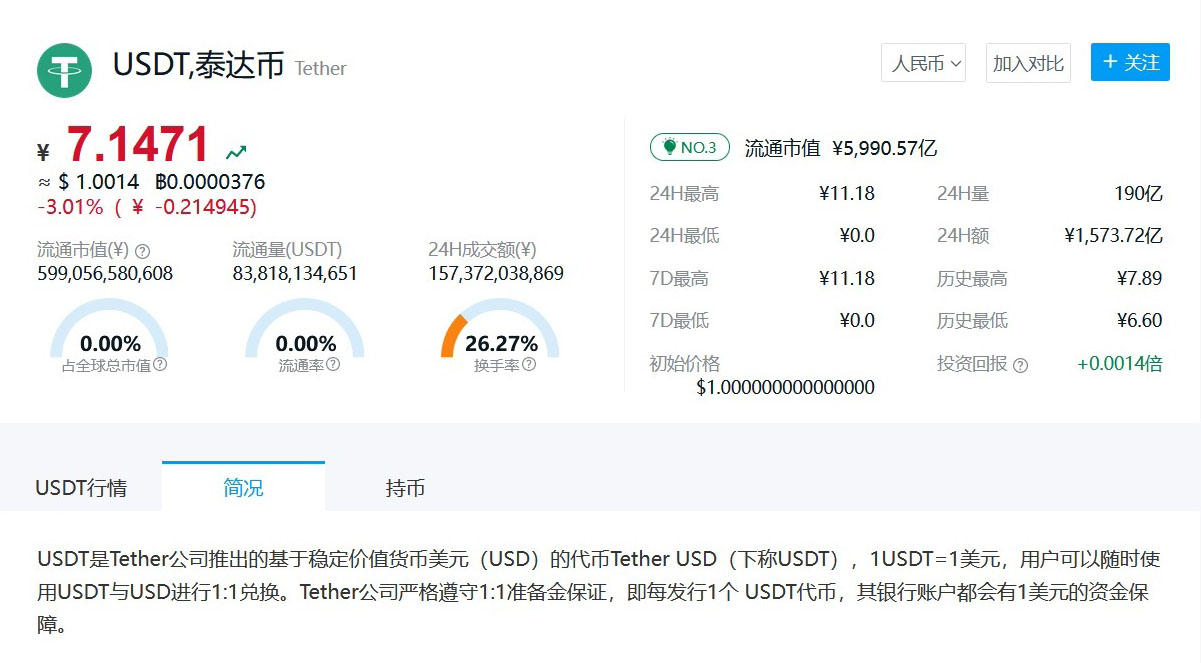 雖然1 USDT 約等于1 美金,但對人民幣的匯率還是會波動