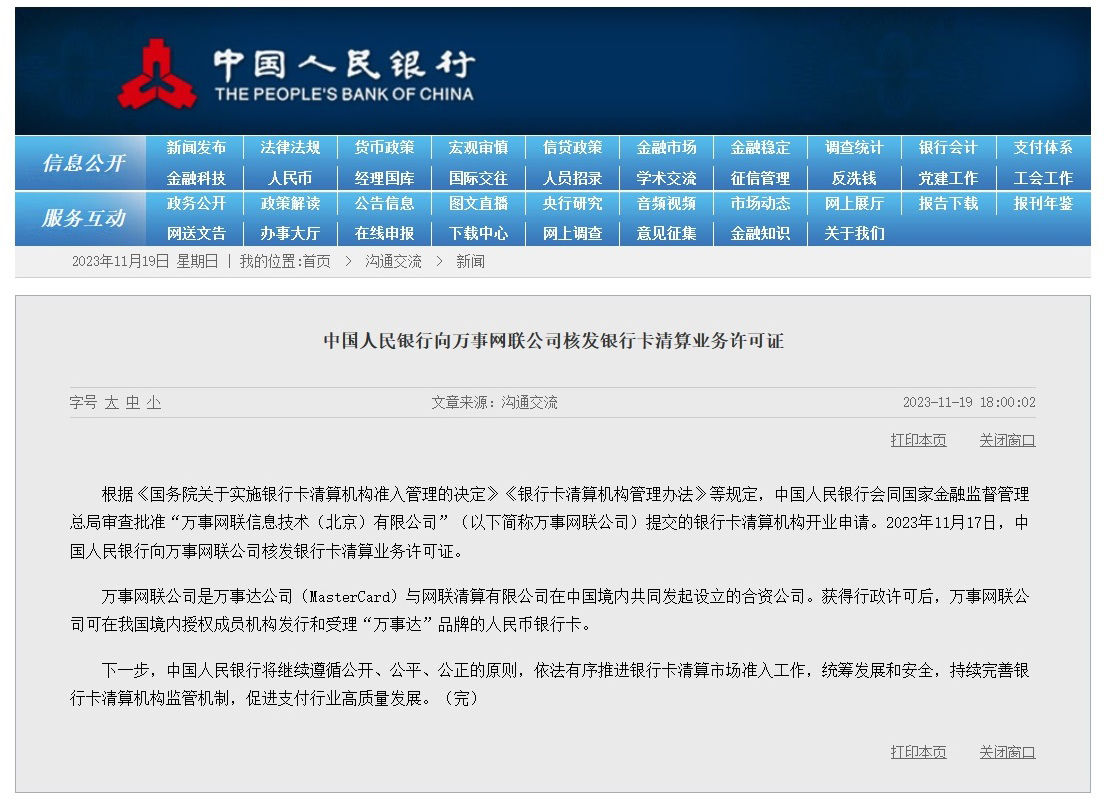 2023年11月17日:中國人民銀行向萬事網(wǎng)聯(lián)公司核發(fā)銀行卡清算業(yè)務許可證