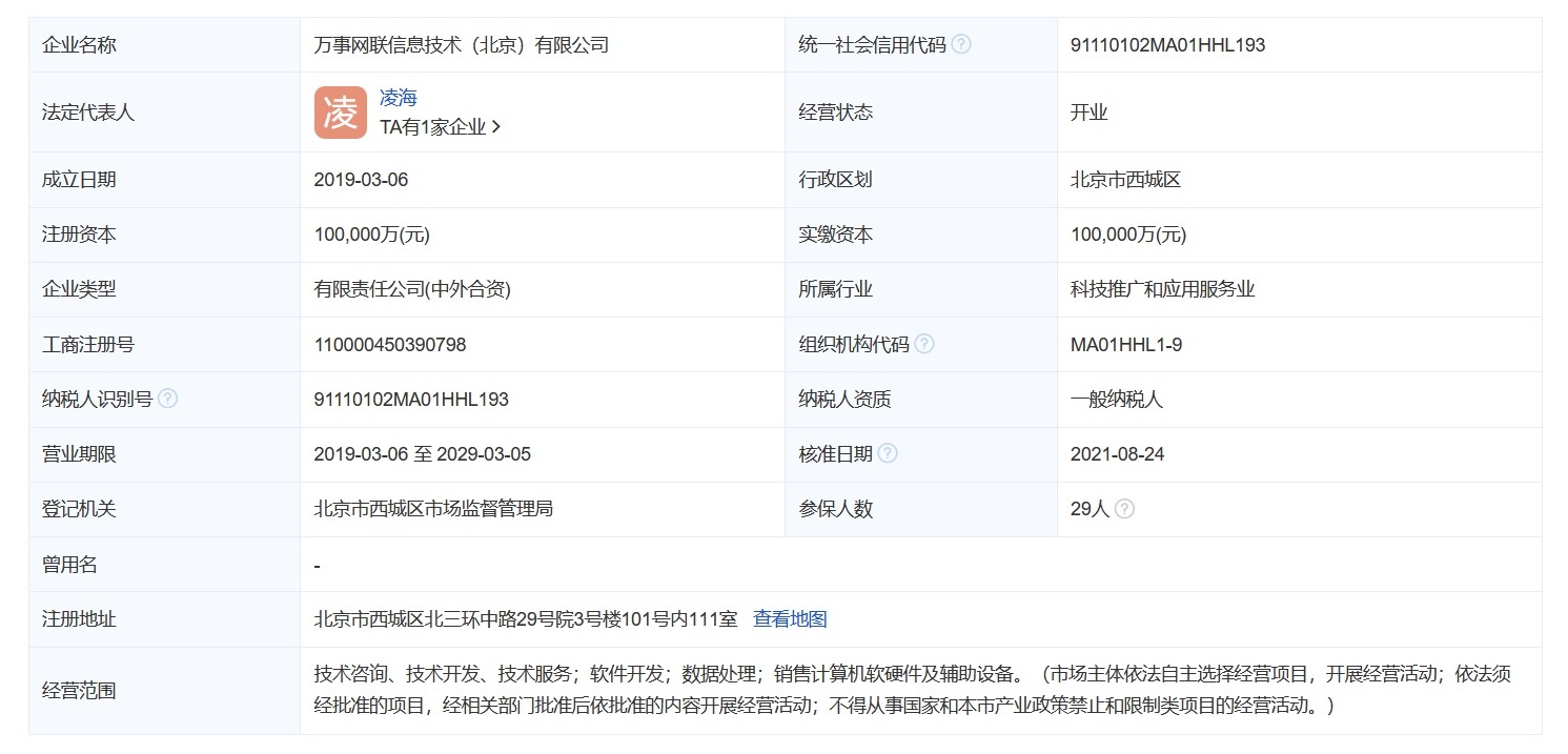 根據(jù)天眼查的信息顯示:萬事網(wǎng)聯(lián)公司注冊資本10億元