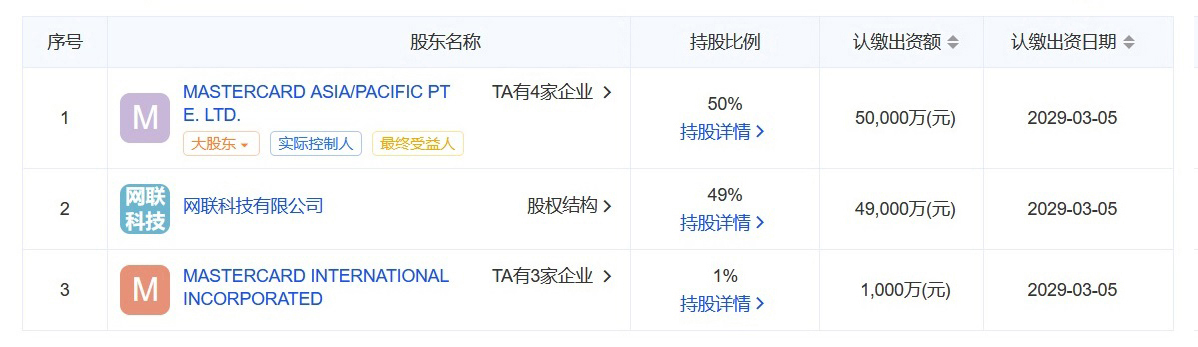 萬事達卡亞太有限公司持股 50%:萬事達卡國際公司(MastercardInternational Incorporated)持股1%、網(wǎng)聯(lián)科技有限公司持股 49%